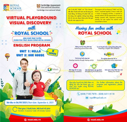 Tháng 9 năm nay thật đặc biệt đối với bậc học mầm non. Trước tình hình dịch bệnh, các bé vẫn phải ở nhà để đảm bảo an toàn sức khỏe. Hiểu được nỗi băn khoăn của đông đảo phụ huynh khi sân chơi và những hoạt động của trẻ bị giới hạn, Trường Song ngữ Quốc tế Hoàng Gia – Royal School đã tổ chức chương trình “Vui chơi trực tuyến, khám phá trực quan cùng Royal School”. Mỗi ngày, các bé mẫu giáo trong độ tuổi từ 3-6 tuổi sẽ gặp gỡ thầy cô và bạn bè qua màn hình trực tuyến để cùng nhau trò chuyện và khám phá những hoạt động vui nhộn.